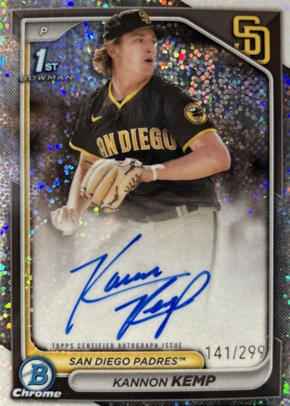 The biggest 30-day change Kannon Kemp cards are 2024 Bowman Chrome #CPA-KK Prospect Auto - Speckle Refractor /299 (1st), 2024 Bowman Chrome #CPA-KK Prospect Auto - Blue Refractor /150 (1st), and 2024 Bowman Chrome #CPA-KK Prospect Auto - Gold Refractor /50 (1st).