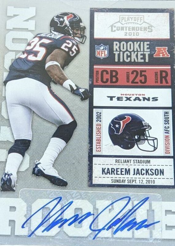 Kareem Jackson's Football cards are available in at least 18 sets. Kareem Jackson's biggest 7-day price movers are 2010 Contenders #157 Rookie Ticket Auto, 2010 Topps Chrome #C48 Purple Refractor /555, and 2010 Topps Chrome #C48 Printing Plates Cyan /1.