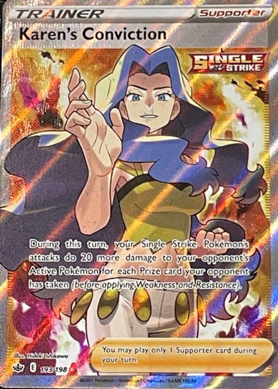Karen's Conviction's Pokemon cards are available in at least 2 sets. Karen's Conviction's biggest 7-day price movers are 2021 Sword & Shield: Chilling Reign #193/198 Holo (Full Art), 2021 Japanese Sword & Shield: Peerless Fighters #89/70 Hyper Rare, and 2021 Sword & Shield: Chilling Reign #216/198 Holo (Secret).