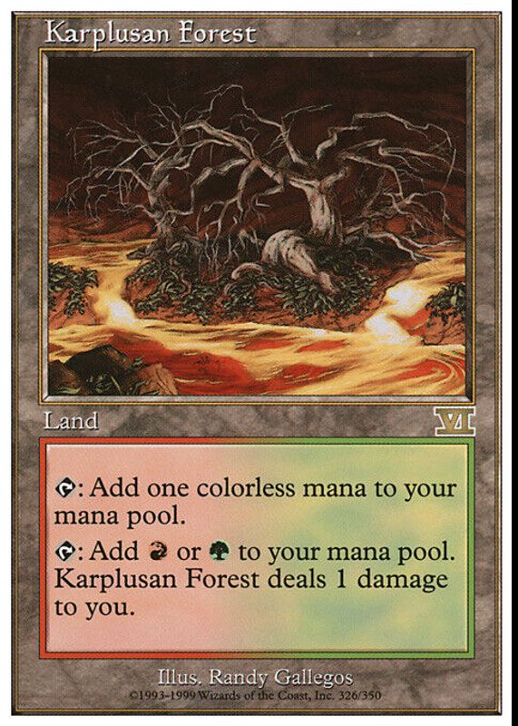 Karplusan Forest's Magic: The Gathering cards are available in at least 2 sets. Karplusan Forest's biggest 7-day price movers are 1999 Sixth Edition #326 Base, and 2001 Seventh Edition #336 Foil.