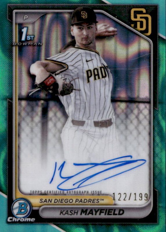 Kash Mayfield's Baseball cards are available in at least 9 sets. Kash Mayfield's biggest 7-day price movers are 2024 Bowman Draft #CPA-KM Chrome DP Auto - Aqua Lava Refractor /199 (1st), 2024 Bowman Draft #CPA-KM Chrome DP Auto - Gold Wave Refractor /50 (1st), and 2024 Bowman Draft #CPA-KM Chrome DP Auto - Black Refractor /10 (1st).
