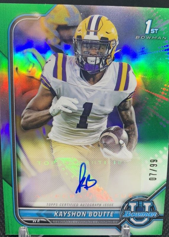 Kayshon Boutte's Football cards are available in at least 9 sets. Kayshon Boutte's biggest 7-day price movers are 2021 Bowman University #BCPA-KB Chrome Prospect Auto - Green Refractor /99 (1st), 2022 Bowman Chrome University #RM-14 Ramblin' Man, and 2021 Bowman University #BCPA-KB Chrome Prospect Auto - Gold Lava Refractor /50 (1st).