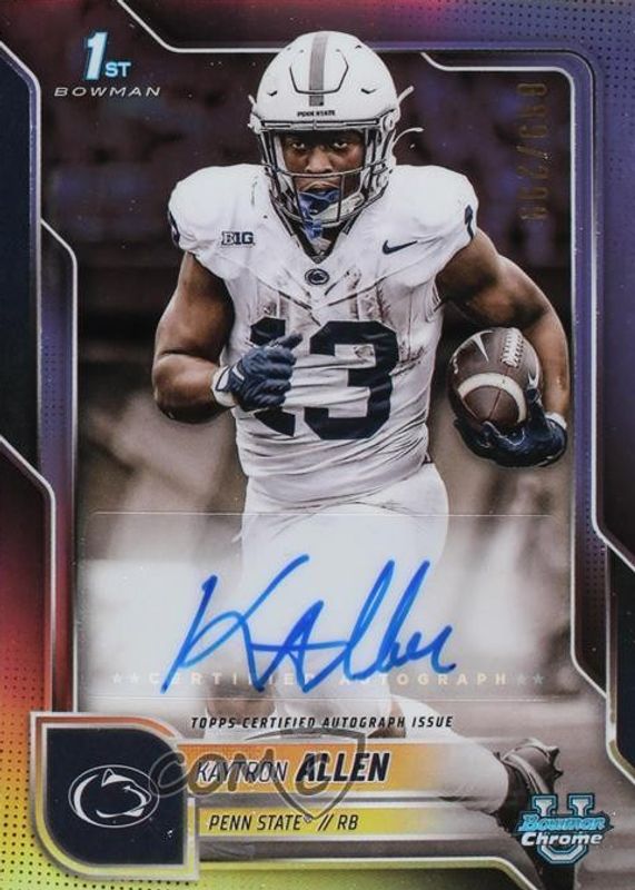Kaytron Allen's Football cards are available in at least 3 sets. Kaytron Allen's biggest 7-day price movers are 2025 Bowman Chrome University #BCA-KA Prospect Auto - Refractor /299 (1st), 2025 Bowman's Best #13 Black Refractor /10, and 2025 Bowman's Best #13 Base.