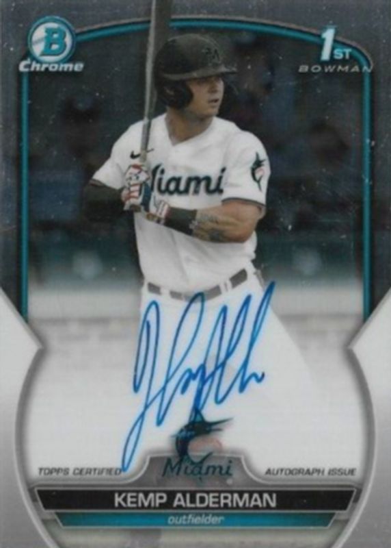 Kemp Alderman's Baseball cards are available in at least 7 sets. Kemp Alderman's biggest 7-day price movers are 2023 Bowman Draft #CDA-KA Chrome DP Auto (1st), 2023 Bowman Draft #CDA-KA Chrome DP Auto - Purple Refractor /250 (1st), and 2024 Prizm #241 Base.