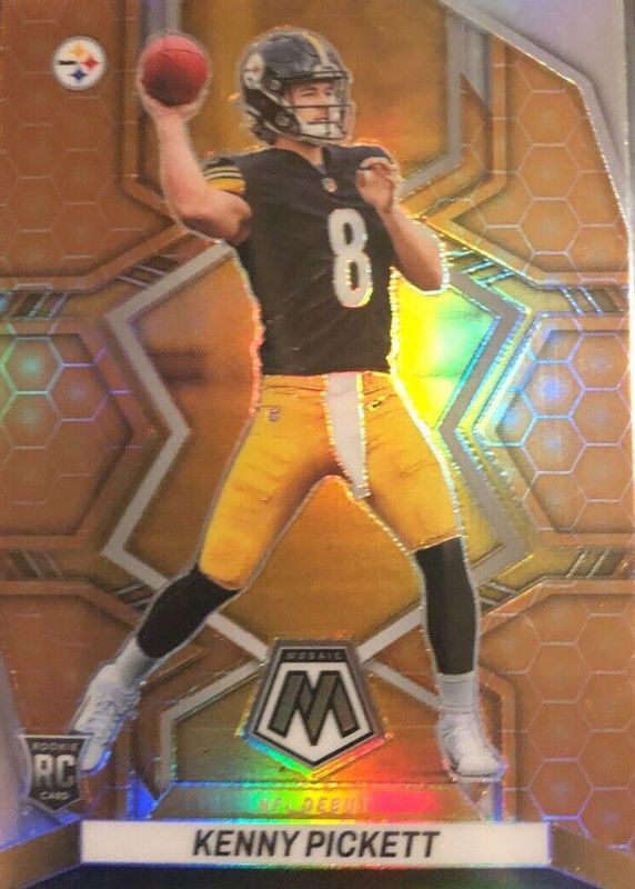 Kenny Pickett's Football cards are available in at least 49 sets. Kenny Pickett's biggest 7-day price movers are 2022 Mosaic #270 NFL Debut - Honeycomb /(SSP), 2022 Spectra #211 Rookie Patch Auto - Neon Orange /15, and 2022 Flawless #RSS-KP Rookie Shadow Signatures - Silver (/15).