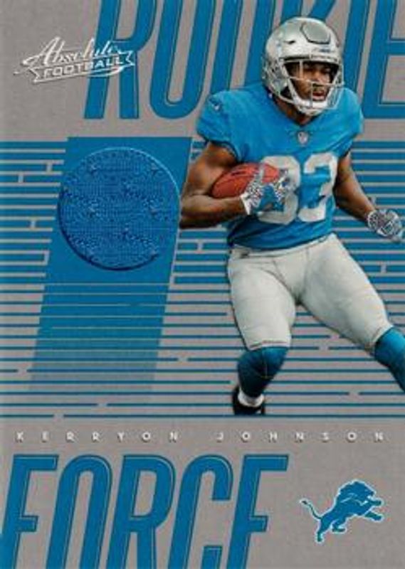 Kerryon Johnson's Football cards are available in at least 50 sets. Kerryon Johnson's biggest 7-day price movers are 2018 Absolute #RF-KJ Rookie Force, 2018 Absolute #BH-KJ Boss Hoggs Autographs Platinum Edition /1, and 2018 Absolute #170 Rookie Premiere Material Autos Spectrum /49.
