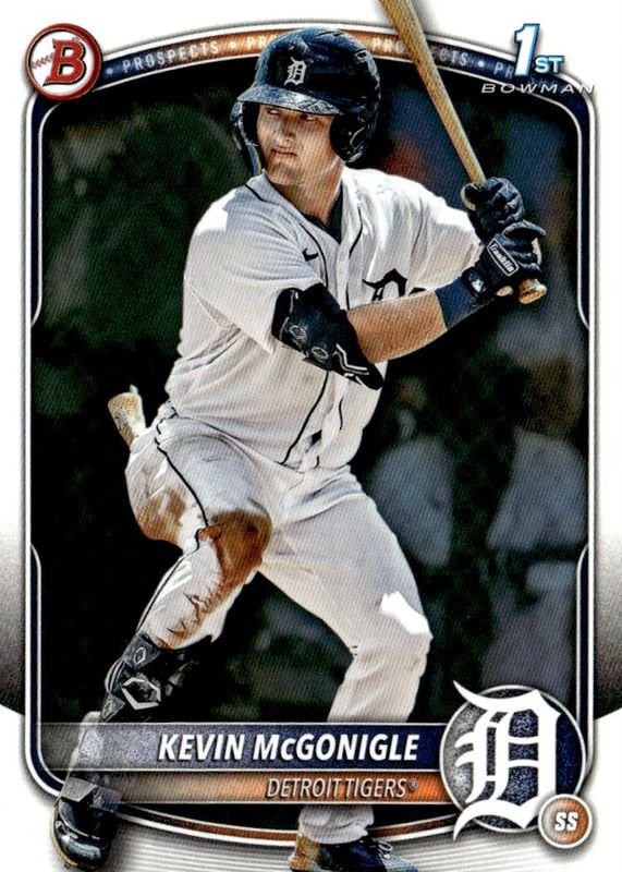 Kevin McGonigle's Baseball cards are available in at least 16 sets. Kevin McGonigle's biggest 7-day price movers are 2025 Bowman #BP-79 Prospects (1st), 2025 Bowman #CPA-KM Chrome Prospect Auto - Refractor /499 (1st), and 2025 Bowman #BCP-79 Chrome Prospects (1st).
