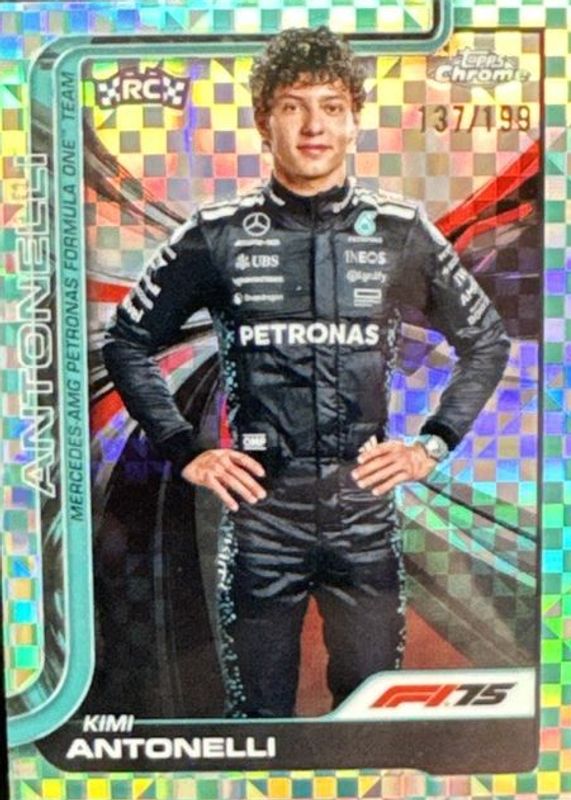 Kimi Antonelli's Racing cards are available in at least 5 sets. Kimi Antonelli's biggest 7-day price movers are 2025 Topps Chrome Formula 1 #8 Aqua Checker Flag Refractor /199, 2024 Topps Chrome Formula 1 #22 Base, and 2025 Topps Chrome Formula 1 #CAC-ANT Chrome Autographs - Gold Refractor /50.