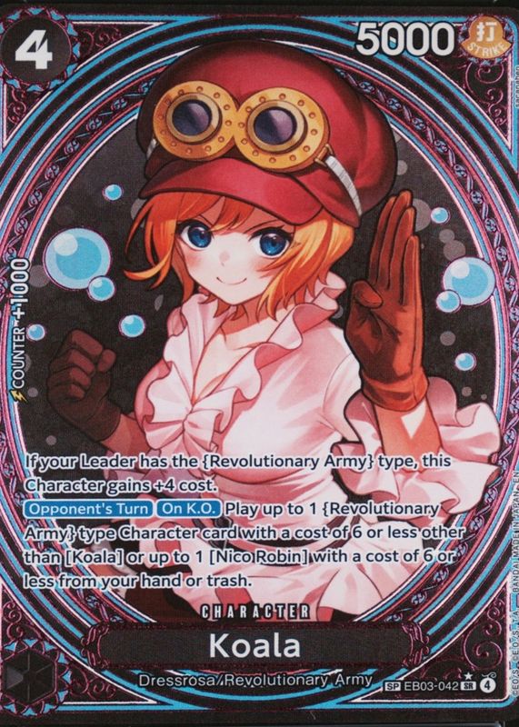 Koala's One Piece cards are available in at least 5 sets. Koala's biggest 7-day price movers are 2026 Extra Booster: Heroines Edition #EB03-042 Super Rare, 2026 Extra Booster: Heroines Edition #EB03-042 Super Rare (Alternate Art), and 2026 Extra Booster: Heroines Edition #EB03-042 Super Rare (SP).