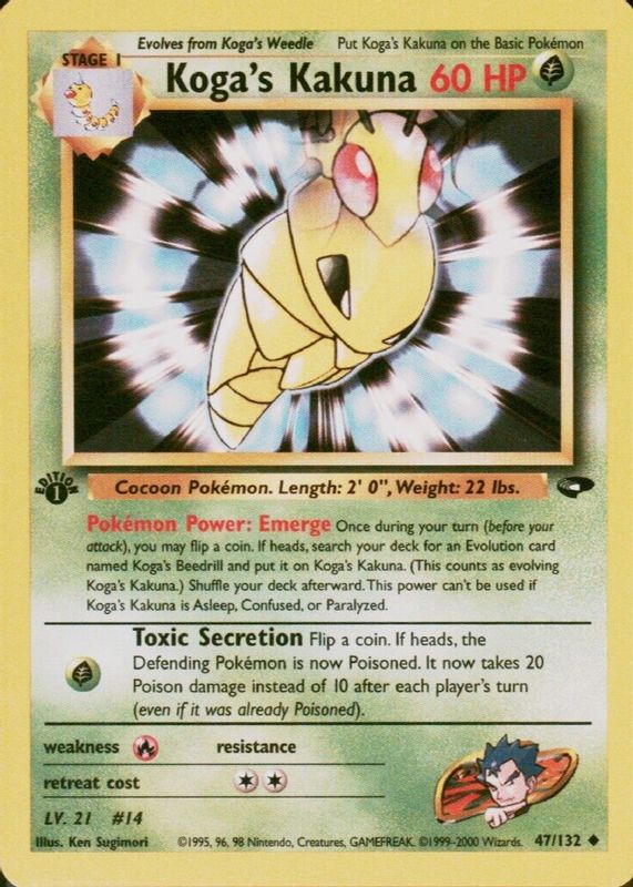 Koga's Kakuna's Pokemon cards are available in at least 1 sets. Koga's Kakuna's biggest 7-day price movers are 2000 Gym Challenge #047/132 1st Edition.