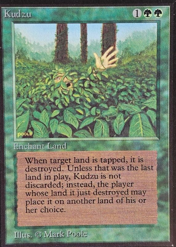 Kudzu's Magic: The Gathering cards are available in at least 3 sets. Kudzu's biggest 7-day price movers are 1993 Beta Edition Base, 1993 Alpha Edition Base, and 1993 Unlimited Edition Base.