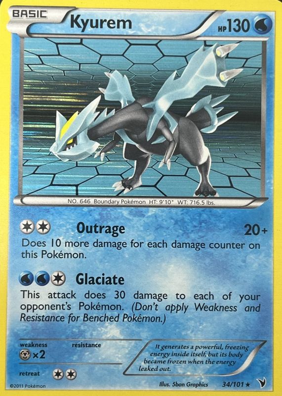 Kyurem's Pokemon cards are available in at least 9 sets. Kyurem's biggest 7-day price movers are 2013 Black & White: Plasma Freeze #031/116 Holo, 2011 Black & White: Noble Victories #034/101 Holo, and 2012 Black & White: Dragon Vault #21/20 Holo (Secret).
