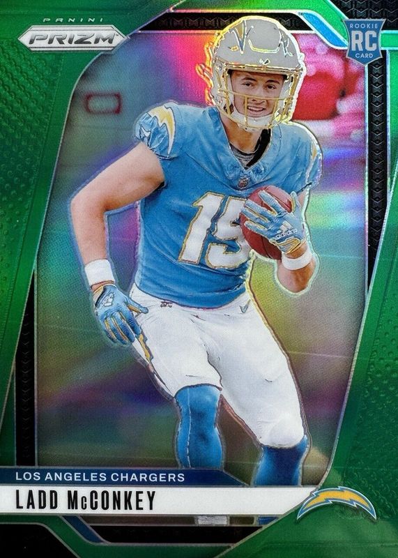 Ladd McConkey's Football cards are available in at least 61 sets. Ladd McConkey's biggest 7-day price movers are 2024 Prizm #RG-LMY Rookie Gear - Neon Green Pulsar, 2024 Donruss #TR-5 The Rookies, and 2024 Optic #266 Stars /(SSP).