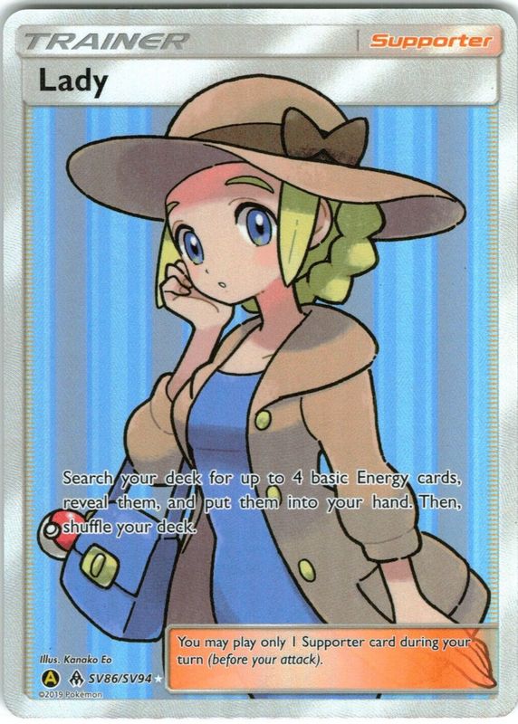 Lady's Pokemon cards are available in at least 4 sets. Lady's biggest 7-day price movers are 2018 Japanese Sun & Moon: Forbidden Light #100/094 Super Rare (Full Art), 2022 Japanese Sword & Shield: Lost Abyss #114/100 Super Rare, and 2022 Japanese Sword & Shield: Lost Abyss #122/100 Hyper Rare.