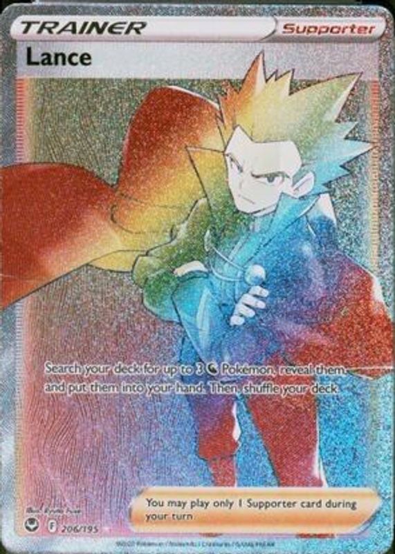 Lance's Pokemon cards are available in at least 2 sets. Lance's biggest 7-day price movers are 2022 Sword & Shield: Silver Tempest #206/195 Holo (Secret), 2022 Japanese Sword & Shield: Paradigm Trigger #114/098 Super Rare, and 2022 Japanese Sword & Shield: Paradigm Trigger #122/098 Hyper Rare.