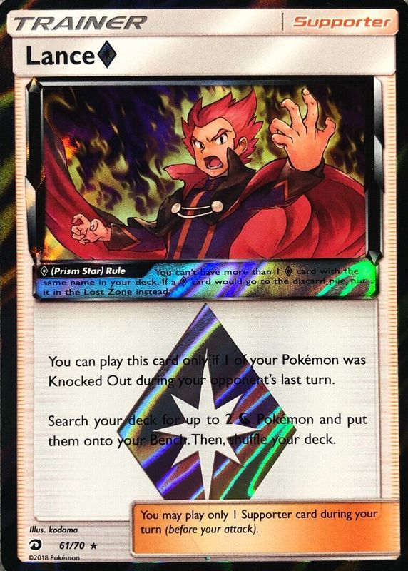 Lance Prism Star's Pokemon cards are available in at least 1 sets. Lance Prism Star's biggest 7-day price movers are 2018 Sun & Moon: Dragon Majesty #61/70 Holo.