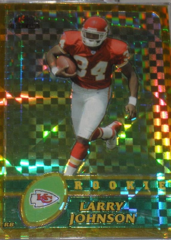 Larry Johnson (NFL)'s Football cards are available in at least 11 sets. Larry Johnson (NFL)'s biggest 7-day price movers are 2003 Topps Chrome #220 Gold X-Fractor /101, 2003 Topps Pristine #111 Base (Common), and 2003 Topps Pristine #112 Base (Uncommon) /1499.