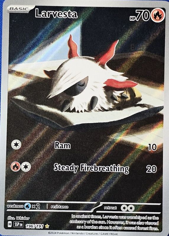 Larvesta's Pokemon cards are available in at least 19 sets. Larvesta's biggest 7-day price movers are 2025 Japanese Scarlet & Violet: Black Bolt #103/086 Art Rare, 2024 Scarlet & Violet: Surging Sparks #196/191 Illustration Rare, and 2025 Scarlet & Violet: Black Bolt #015/086 Master Ball Reverse Holo.