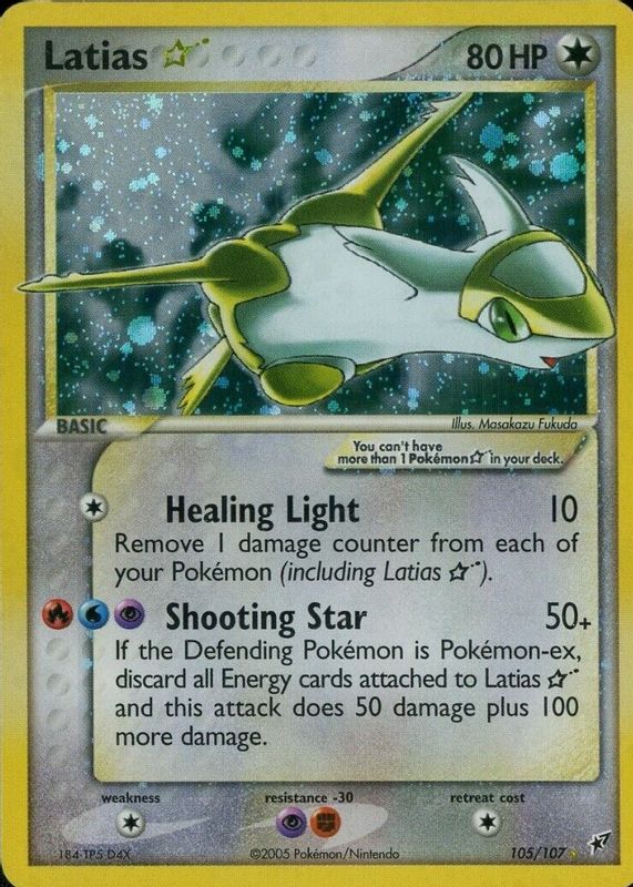 Latias Star's Pokemon cards are available in at least 2 sets. Latias Star's biggest 7-day price movers are 2005 EX: Deoxys #105/107 Holo, 2004 Japanese EX: Clash of the Blue Sky #065/082 1st Edition Holo, and 2004 Japanese EX: Clash of the Blue Sky #065/082 Unlimited Holo.