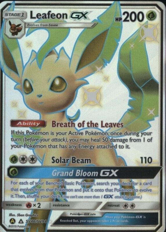 Leafeon GX's Pokemon cards are available in at least 5 sets. Leafeon GX's biggest 7-day price movers are 2018 Japanese Sun & Moon: GX Ultra Shiny #206/150 Shiny Super-Rare (Full Art), 2017 Japanese Sun & Moon: Ultra Sun #073/066 Hyper Rare, and 2017 Japanese Sun & Moon: Ultra Sun #012/066 Double Rare.