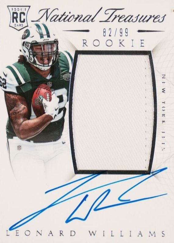 Leonard Williams' Football cards are available in at least 4 sets. Leonard Williams' biggest 7-day price movers are 2015 National Treasures #121 Rookie Patch Auto /99, 2015 National Treasures #121 Rookie Patch Auto - Blue /1, and 2015 National Treasures #121 Rookie Patch Auto - Numbers Green (/62).
