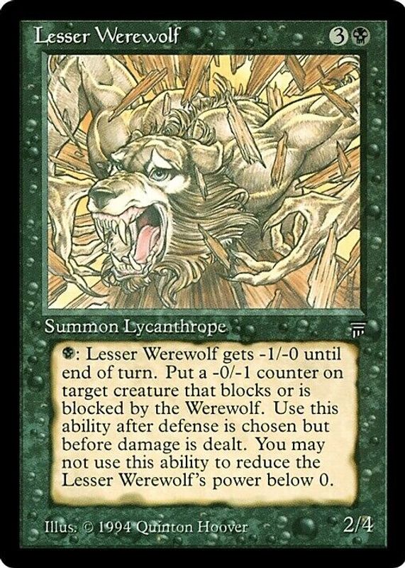 Lesser Werewolf's Magic: The Gathering cards are available in at least 1 sets. Lesser Werewolf's biggest 7-day price movers are 1994 Legends Base.