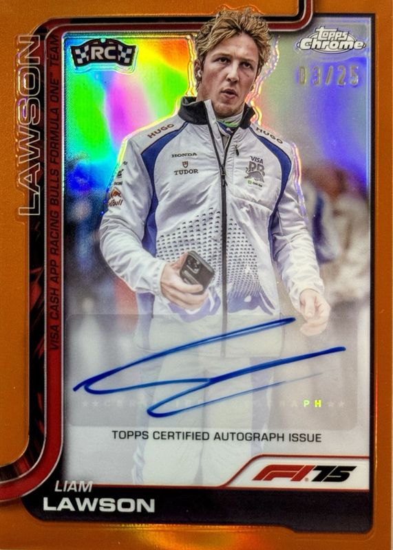 Liam Lawson's Racing cards are available in at least 11 sets. Liam Lawson's biggest 7-day price movers are 2025 Topps Chrome Formula 1 #CH-6 The Chain /(SSP), 2025 Topps Chrome Formula 1 #FUT-1 Futuro /(SSP), and 2025 Topps Chrome Formula 1 #CAC-LAW Chrome Autographs.