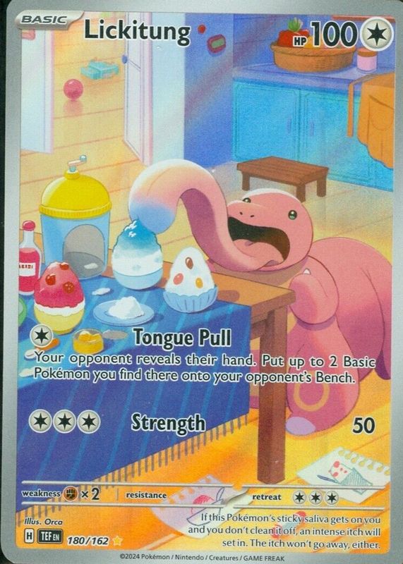 Lickitung's Pokemon cards are available in at least 26 sets. Lickitung's biggest 7-day price movers are 2024 Japanese Scarlet & Violet: Cyber Judge #082/071 Art Rare, 2006 EX: Dragon Frontiers #019/101 Reverse Holo, and 2004 EX: FireRed & LeafGreen #037/112 Reverse Holo.