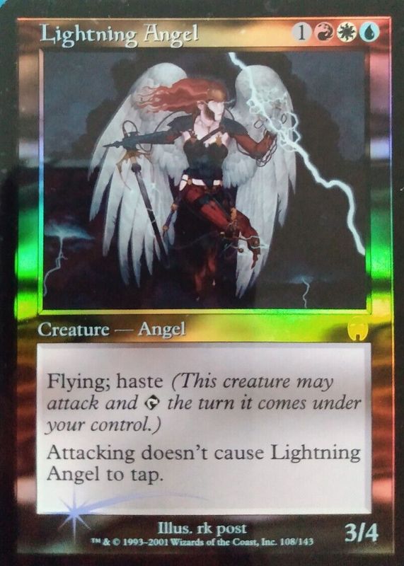 Lightning Angel's Magic: The Gathering cards are available in at least 1 sets. Lightning Angel's biggest 7-day price movers are 2001 Apocalypse #108 Foil, and 2001 Apocalypse #108 Base.
