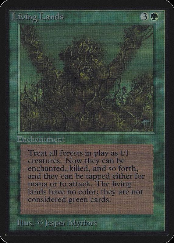 Living Lands' Magic: The Gathering cards are available in at least 4 sets. Living Lands' biggest 7-day price movers are 1993 Alpha Edition Base, 1993 Beta Edition Base, and 1993 Unlimited Edition Base.