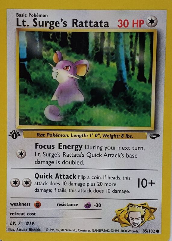 Lt. Surge's Rattata's Pokemon cards are available in at least 2 sets. Lt. Surge's Rattata's biggest 7-day price movers are 2000 Gym Challenge #085/132 1st Edition, and 2000 Gym Heroes #082/132 1st Edition.