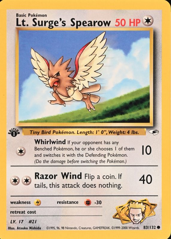 Lt. Surge's Spearow's Pokemon cards are available in at least 1 sets. Lt. Surge's Spearow's biggest 7-day price movers are 2000 Gym Heroes #083/132 1st Edition, and 2000 Gym Heroes #052/132 1st Edition.