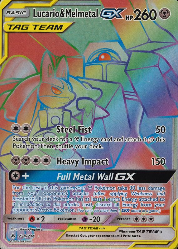 Lucario & Melmetal GX's Pokemon cards are available in at least 2 sets. Lucario & Melmetal GX's biggest 7-day price movers are 2019 Sun & Moon: Unbroken Bonds #224/214 Holo (Secret), 2019 Japanese Sun & Moon: Full Metal Wall #029/054 Double Rare, and 2019 Sun & Moon: Unbroken Bonds #203/214 Holo (Full Art).