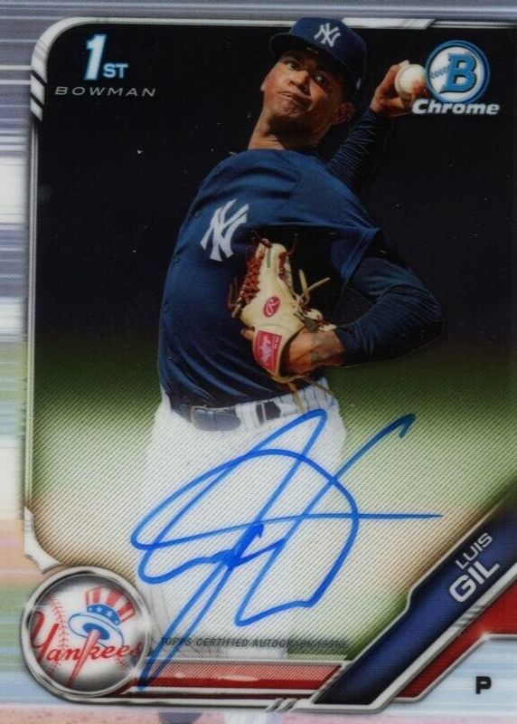 Luis Gil's Baseball cards are available in at least 40 sets. Luis Gil's biggest 7-day price movers are 2019 Bowman Chrome #CPA-LGI Prospect Auto (1st), 2019 Bowman Chrome #CPA-LGI Prospect Auto - Green Atomic Refractor /99 (1st), and 2025 Topps Museum Collection #MMII-LGI Museum Memorabilia /1.