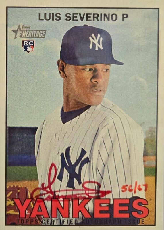 Luis Severino's Baseball cards are available in at least 68 sets. Luis Severino's biggest 7-day price movers are 2016 Topps Heritage #ROA-LS Real One Autographs - Red Ink /67, 2016 Topps Chrome Base, and 2016 Topps Base.