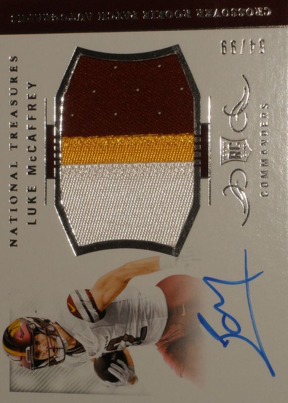 Luke McCaffrey's Football cards are available in at least 25 sets. Luke McCaffrey's biggest 7-day price movers are 2024 Optic #268 Blue Scope, 2024 National Treasures #CRPA-LMY Crossover Rookie Patch Autographs /99, and 2024 Prizm #367 Snakeskin /(SSP).