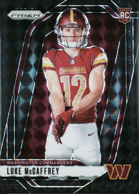Luke McCaffrey's Football cards are available in at least 29 sets. Luke McCaffrey's biggest 7-day price movers are 2024 Prizm #26 Rookie Variation - Black Finite /1, 2024 Contenders #121 Rookie Ticket Auto, and 2024 Topps Finest #264 Rare - Black Geometric Refractor /15.