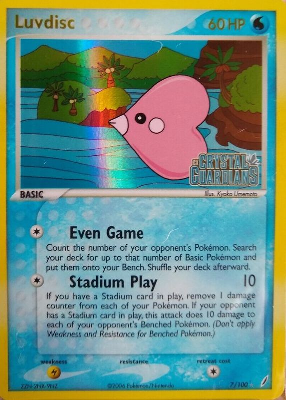 Luvdisc's Pokemon cards are available in at least 15 sets. Luvdisc's biggest 7-day price movers are 2006 EX: Crystal Guardians #007/100 Reverse Holo, 2004 EX: Hidden Legends #040/101 Base, and 2018 Japanese Sun & Moon: Sky-Splitting Charisma #030/096 Base.