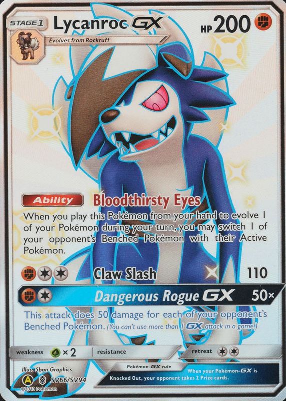 Lycanroc GX's Pokemon cards are available in at least 7 sets. Lycanroc GX's biggest 7-day price movers are 2019 Sun & Moon: Hidden Fates #SV66/SV94 Shiny Rare (Full Art), 2017 Japanese Sun & Moon: Alolan Moonlight #027/050 Double Rare, and 2017 Sun & Moon: Burning Shadows #155/147 Holo (Secret).