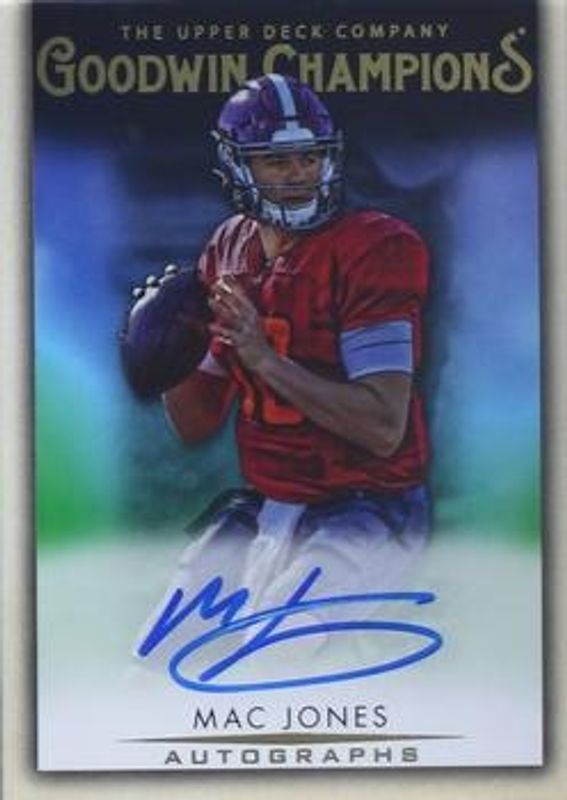Mac Jones' Multi-Sport cards are available in at least 19 sets. Mac Jones' biggest 7-day price movers are 2021 Upper Deck Goodwin Champions #A-MJ Autographs, 2021 Upper Deck Goodwin Champions #M-JO Memorabilia Premium /25, and 2021 Upper Deck Goodwin Champions #SM-JO Splash of Color Memorabilia Premium /25.