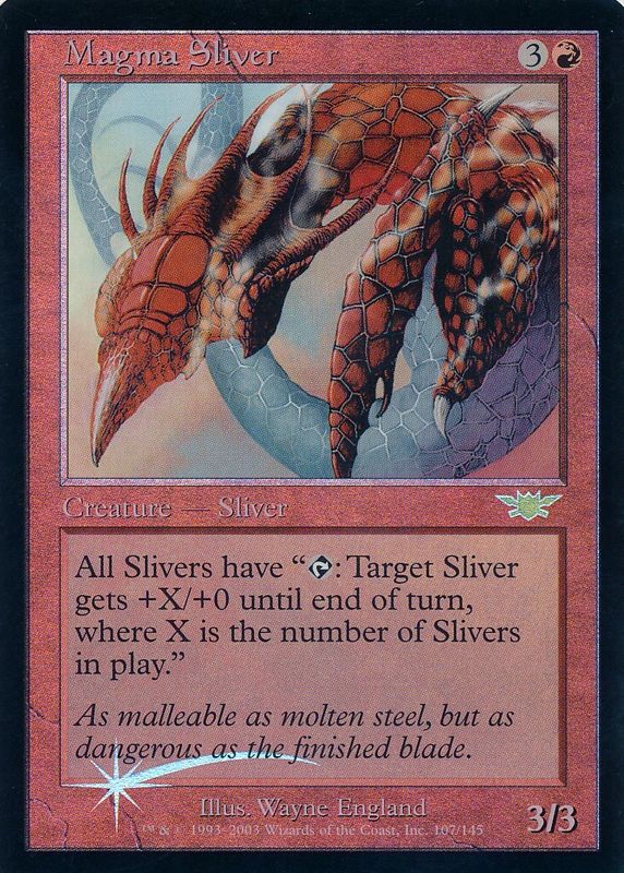 Magma Sliver's Magic: The Gathering cards are available in at least 1 sets. Magma Sliver's biggest 7-day price movers are 2003 Legions #107 Foil, and 2003 Legions #107 Base.