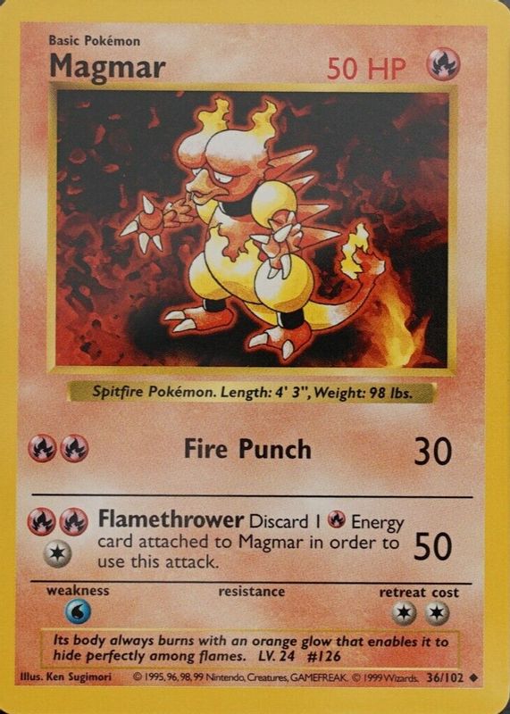 Magmar's Pokemon cards are available in at least 38 sets. Magmar's biggest 7-day price movers are 1999 Fossil #39/62 1st Edition, 2023 Japanese Scarlet & Violet: 151 #126/165 Reverse Holo, and 1997 Japanese Topsun #126 Blue Back (1st Edition).