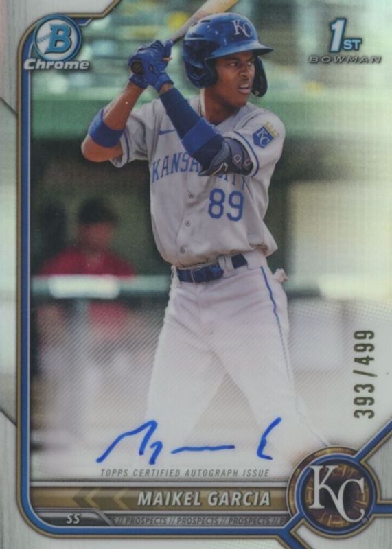 Maikel Garcia's Baseball cards are available in at least 14 sets. Maikel Garcia's biggest 7-day price movers are 2022 Bowman Chrome #CPA-MG Prospect Auto - Refractor /499 (1st), 2025 Topps #135 Golden Mirror Image Variation /(SSP), and 2022 Bowman Chrome #CPA-MG Prospect Auto - Gold Shimmer Refractor /50 (1st).