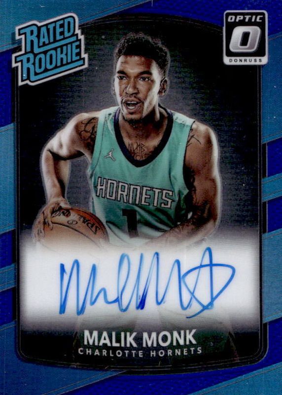 The biggest 30-day change Malik Monk cards are 2017 Optic #190 Rated Rookie Signatures, 2017 Donruss #190 Base, and 2017 Optic #190 Rated Rookie Signatures - Blue /49.