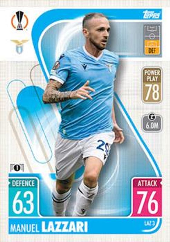 The biggest 30-day change Manuel Lazzari cards are 2021 Topps Match Attax Champions & Europa League #LAZ3 Italy Update, 2022 Topps Match Attax UEFA Champions League & UEFA Europa League #355 1st Edition, and 2022 Topps Match Attax UEFA Champions League & UEFA Europa League #355 Base.