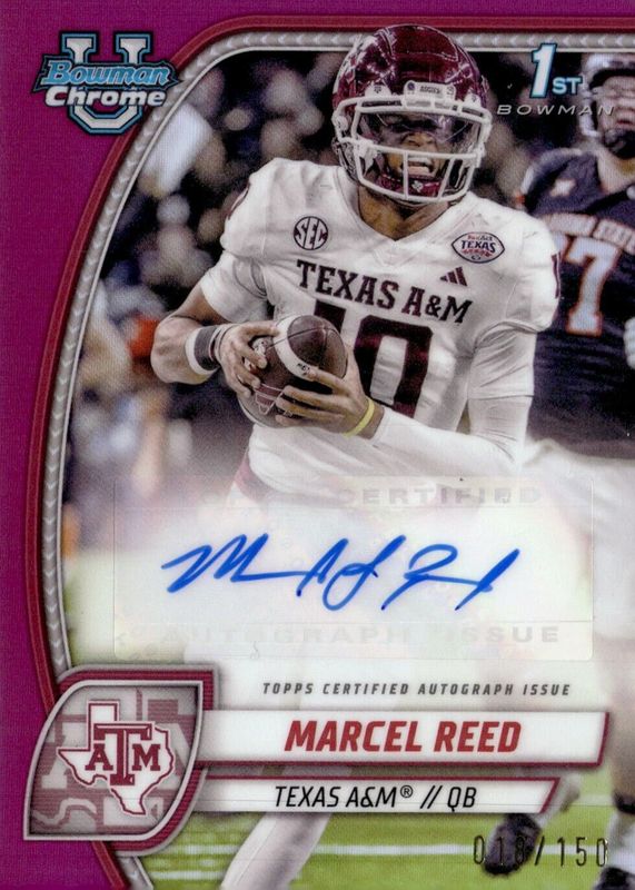 Marcel Reed's Football cards are available in at least 7 sets. Marcel Reed's biggest 7-day price movers are 2024 Bowman Chrome University #PA-MR Prospect Auto - Fuchsia Refractor /150 (1st), 2025 Prizm Draft Picks #7 Color Blast /(SSP), and 2024 Bowman Chrome University #PA-MR Prospect Auto - Refractor /299 (1st).
