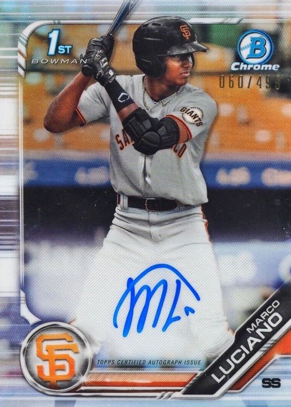 Marco Luciano's Baseball cards are available in at least 54 sets. Marco Luciano's biggest 7-day price movers are 2024 Topps #HFA-16 Home Field Advantage /(SSP), 2019 Bowman #CPA-ML Chrome Prospect Auto - Refractor /499 (1st), and 2019 Bowman #CPA-ML Chrome Prospect Auto - Blue Refractor /150 (1st).