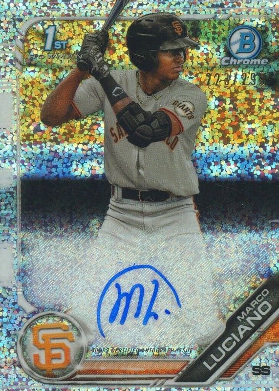 Marco Luciano's Baseball cards are available in at least 54 sets. Marco Luciano's biggest 7-day price movers are 2019 Bowman #BCP-82 Chrome Prospects (1st), 2019 Bowman #CPA-ML Chrome Prospect Auto - Speckle Refractor /299 (1st), and 2024 Topps Dynasty #AJP-ML Autographed Jumbo Patch - Gold /1.