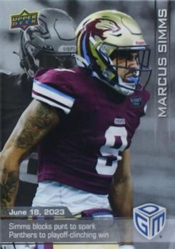Marcus Simms' Multi-Sport cards are available in at least 1 sets. Marcus Simms' biggest 7-day price movers are 2023 Upper Deck Game Dated Moments #28 Silver, 2023 Upper Deck Game Dated Moments #28 Gold, and 2023 Upper Deck Game Dated Moments #28 Base.