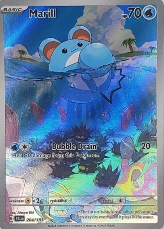 Marill's Pokemon cards are available in at least 29 sets. Marill's biggest 7-day price movers are 2024 Scarlet & Violet: Stellar Crown #033/142 Reverse Holo, 2000 Neo Genesis #66/111 1st Edition, and 2023 Scarlet & Violet: Paldea Evolved #204/193 Illustration Rare.